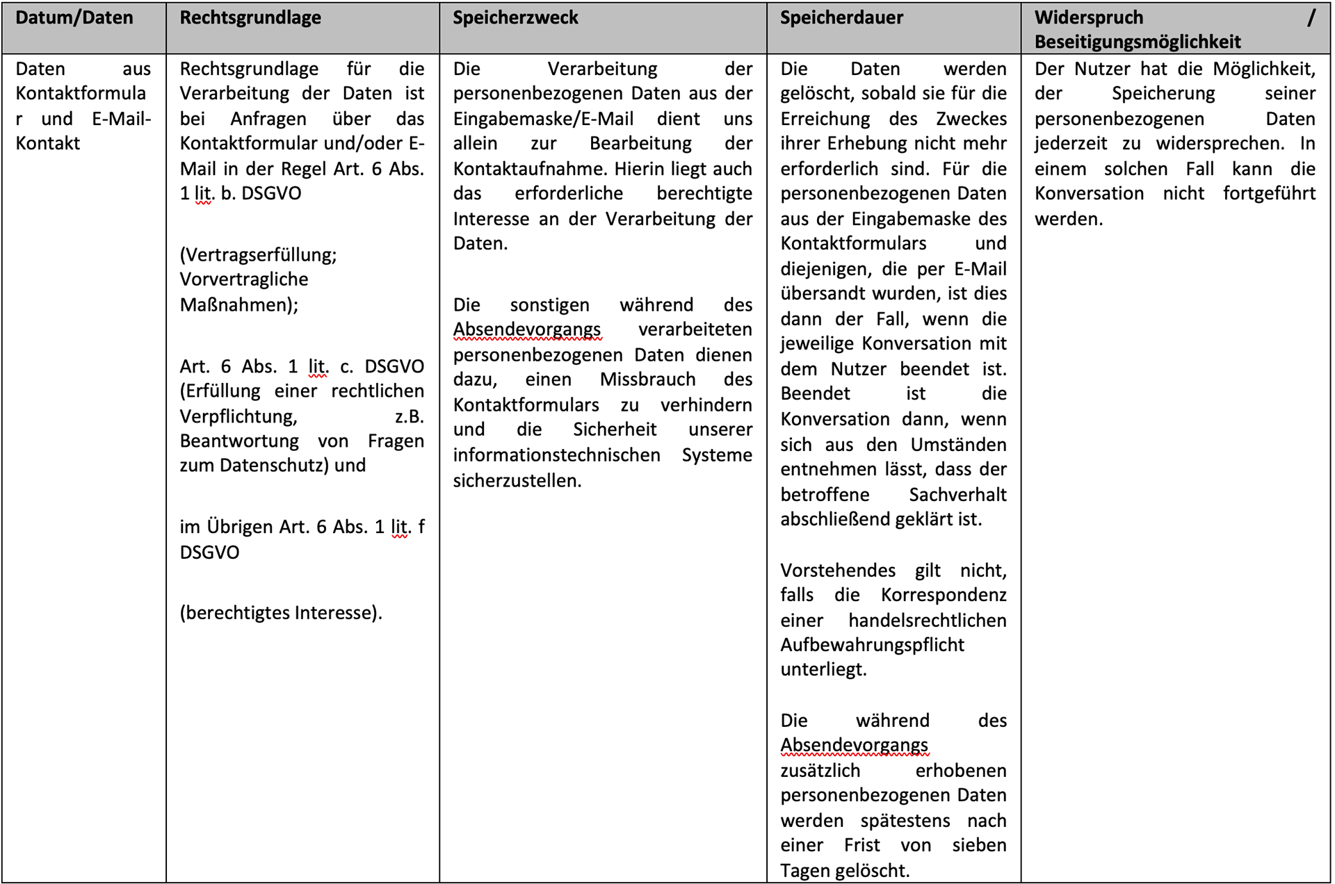 Alternativ ist eine Kontaktaufnahme über die bereitgestellte E-Mail-Adresse möglich. In diesem Fall werden die mit der E-Mail übermittelten personenbezogenen Daten des Nutzers gespeichert.
